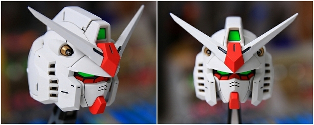 メッキフレームやオープンハッチなど。組みやすさもシンプルに設計してあります。ホホのラインが立体段差アレンジになっています。ここはスジボリを入れ直すか、思い切って全部平にしてからアニメ設定どおりの縦線にしてもいいですね。