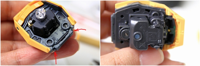スイッチの対策として、初心者でもできる一番簡単なのはこうかな。赤矢印のダボ(1mmの四角形)を切り落とすことで、写真の首周り&LEDユニットの取り外しが簡単に行えるようになります。裏返すとスイッチがあるので、これを押してスイッチON。そのまま胴体に戻します。1分たてば自動的にスイッチオフになるので、OFFの操作は不要です。