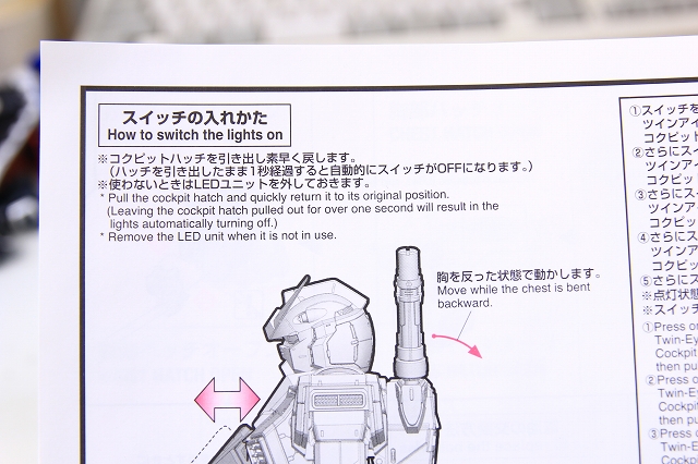 LEDのスイッチをONにするためには、まずコクピットを上に3mmくらい持ち上げて、それから前方に5mmくらいずらします。そのあと逆の手順で素早く元に戻します。この開け閉めを1秒以内に行わないといけません。1秒をすぎるとスイッチがOFFになってしまい、発光しません。