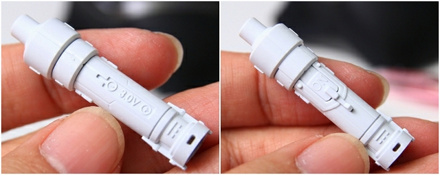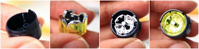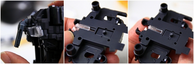 サーベルの光を利用して、導光管を通してノズルが発光します。やはり構造的に光量ロスが大きい。ここも全部自作したほうが幸せになれると思います。