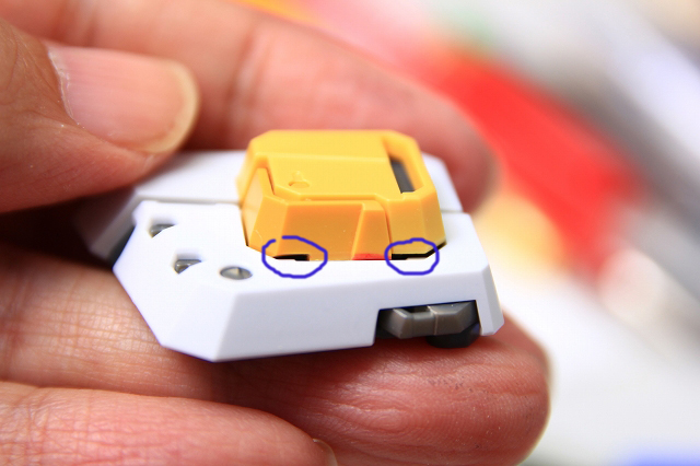 また右写真の青で囲った2箇所は、よほどうまく組み付ければギリギリ正常に動きそうですが、実用的には白いプレートと干渉し、可動が閉じなくなります。ここはスリット状にカットすれば見栄えも損なわず、スムーズに可動するようになります。