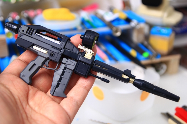 最近の全指可動ギミックも素晴らしいのですが、ライフルを持てなかったり、加工塗装ができなかったりのデメリットも多かった。また完成品を納品した依頼者様から「完成見本のように指を再現できないので、固定してほしい」というリクエストもありました。指先の絶妙なニュアンスは、ガンプラ歴40年でも本当に難しいです。