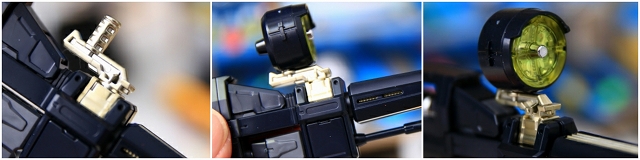 また、シールド下端には左手握り用グリップがありますが、けっこう取り付けが難しく、角度や位置も固定されてしまいます。マグネットだけで十分保持できますので、下端のグリップは使用しなくてもOKです。