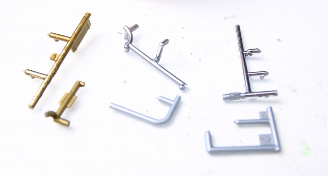 キットには3種類のメッキパーツがあります。このイエローメッキはムラが多いです(個体差かな?)。あと個人的に好みの色味ではありませんので、本番製作ではメッキは落として再塗装します。(メッキ落としについては文末に記載)