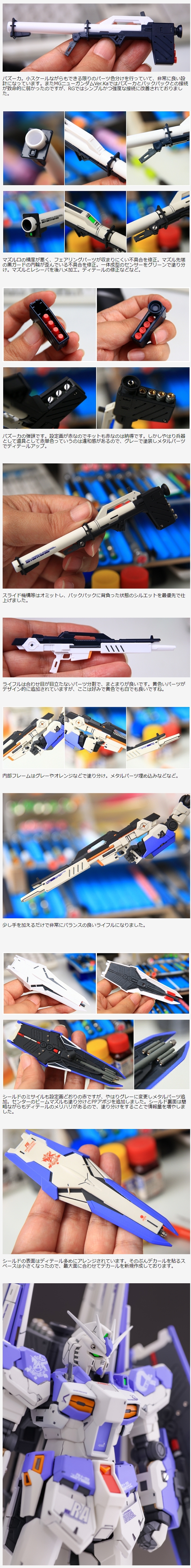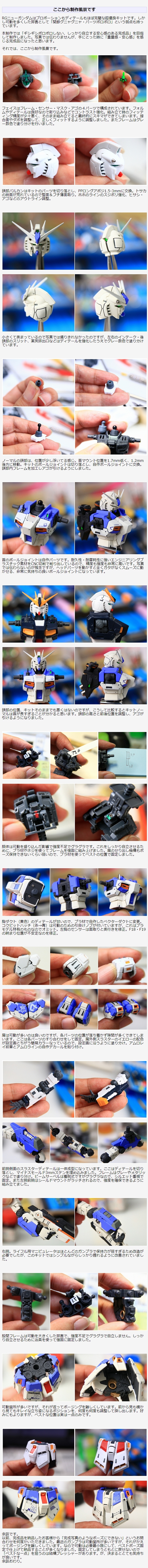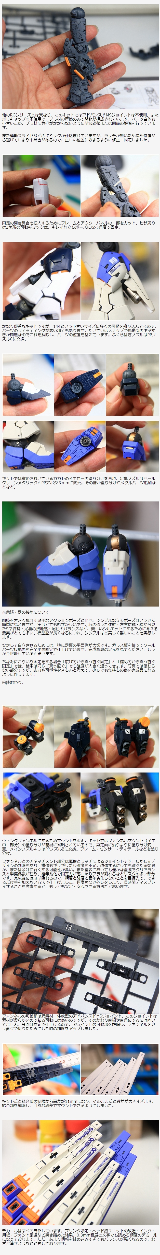 近年のガンプラは可動を多くしたり細かいパネル分割など、より高密度な進化をしています。しかしその弊害として「関節グラグラ・パーツポロポロ」という弱点があります。本制作ではそういった脆弱な部分を補強し、美しい立ちポーズでしっかり自立する完成品を目指して制作しました。またカラーリングをハイニューガンダム風にアレンジしました。