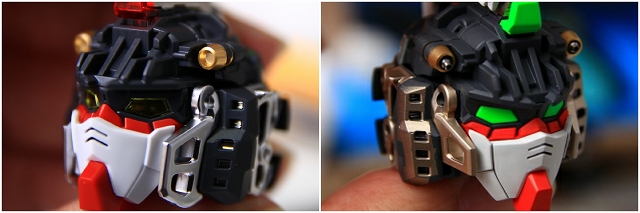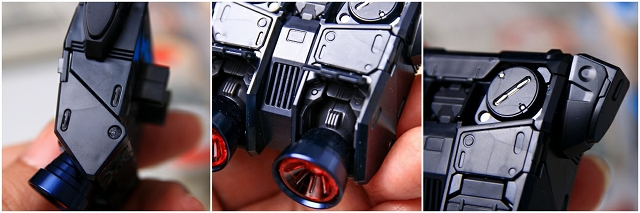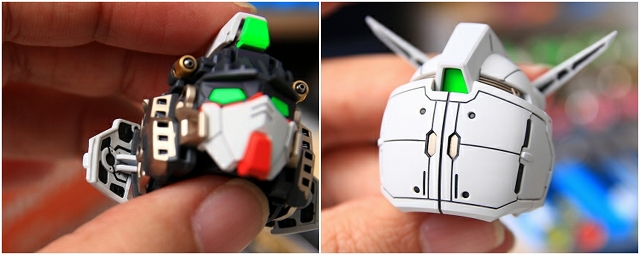 頭部発光について。LEDユニットは首の下の胸のあたりに位置します。LEDの光は喉・頭部のクリアーパーツを通り、ツインアイとセンサー前後を光らせます。