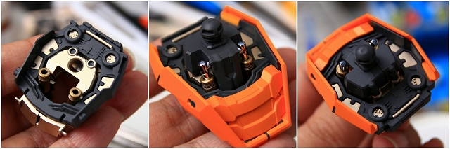 ヘリウムコア(黄色)は2軸の可動があります。まず内側に向けて開き、そのあと2軸とも可動がスムーズになります。白プレート外側は、まず外側に3mmくらいスライドすると、回転可動ができるようになります。