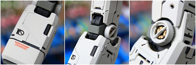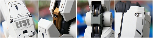 アドバンスドMSジョイントのPE・PP部分は加工や塗装ができないのですが、できる限りの整形や色合わせを行いました。またヒザ裏のように周囲の色をハイキーにすることで、PEPP部分を目立たなくなるようにできたと思います。そのほか、メッキ落とし、フレーム塗り分けのバランス取り、メタルパーツ追加、などなど。