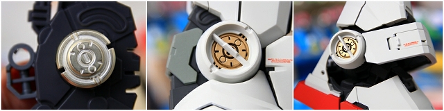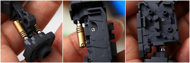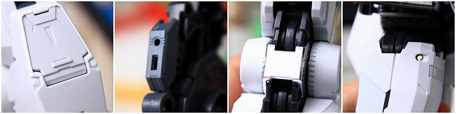 前腕には金属プレス製パーツが仕込まれています。これがシールド側の磁石でマウント結合される仕組みです。磁力の強さは静的ディスプレイには十分ですが、移動やポーズ変更するときは外れ落ちるかもしれませんので注意してください。金属プレスパーツはスライドハッチを閉じると隠れます。