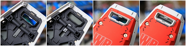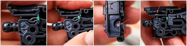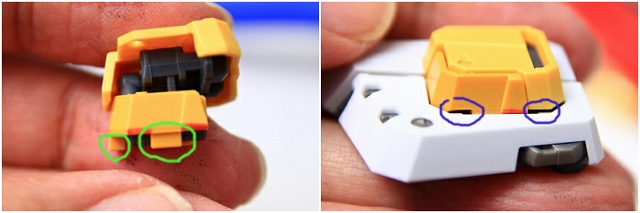 また右写真の青で囲った2箇所は、よほどうまく組み付ければギリギリ正常に動きそうな設計ですが、実用的には白いプレートと干渉し、可動が閉じなくなります。ここはスリット状にカットしスムーズに可動できるように改善しました。