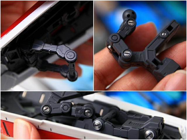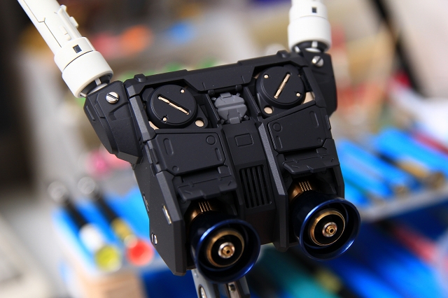 LED内蔵ビームサーベルを差し込むことで、光がバックパック内クリアーパーツを通り、ノズルが光る仕組み、しかし導線が長いため光量が少ない。また消灯するとクリアーレッドパーツのオモチャっぽいディテールが目立ってしまう。ですので発光ギッミックはオミットすることにしました。