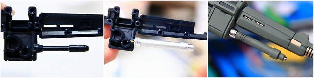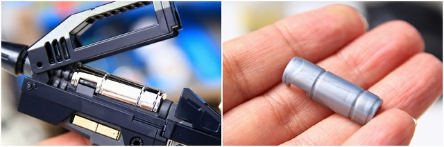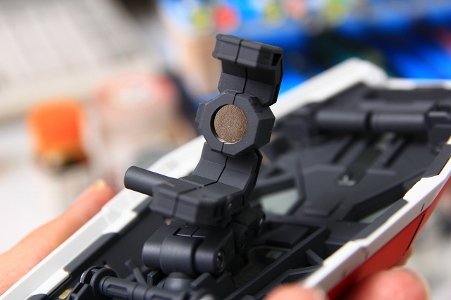 左手グリップにマウントされるマグネット。なぜかこの部分は完成状態でキットに入っています。小さいヤスリやマスキングで製作していきます。