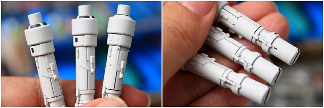 サーベルは3本あります。そのうち1本がLED発光内蔵です。発光サーベルだけは金型もディテールもちがう、素材も(なにかの繊維を織り込んだような)不思議な硬さがありました。そのため加工や塗装の感覚がだいぶ違ったのですが、できるだけ3本が揃うようにしました。