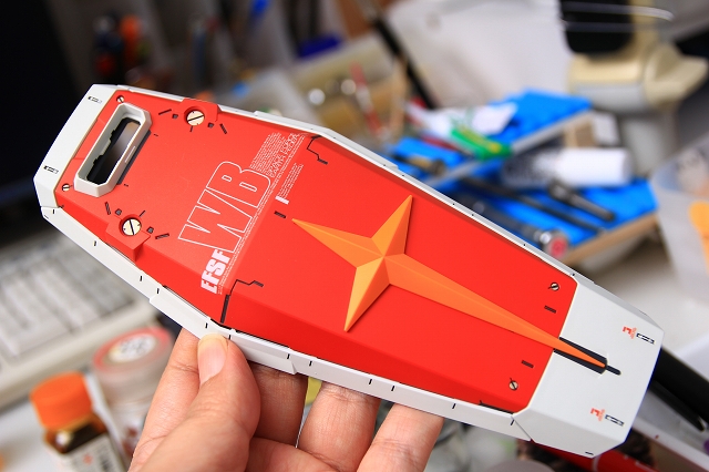 シールド表面はアニメのように柔らかい曲面構成になっていて、良い感じ。それにあわせて連邦十字の取付面も湾曲しています。ただやはり3D曲面同士の取り付けは精度が難しく隙間ができがち。