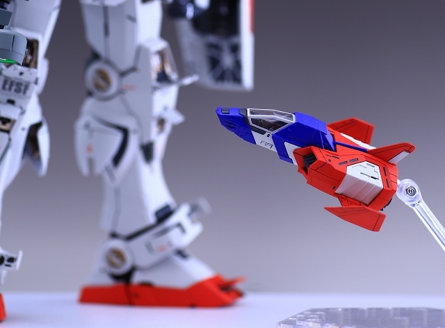 従来のコアファイターは直線的な解釈が多かったですが、PGUガンダムは複雑な曲面構成でマッシブなラインになりました。すごく凝ったアレンジです。垂直尾翼は赤1色だったので、赤白の塗り分けにしました。
