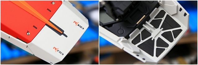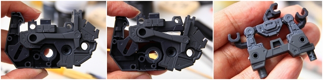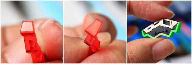 また右写真の青で囲った2箇所は、よほどうまく組み付ければギリギリ正常に動きそうな設計ですが、実用的には白いプレートと干渉し、可動が閉じなくなります。ここはスリット状にカットしスムーズに可動できるように改善しました。