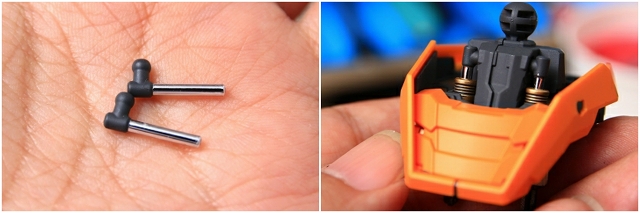 で、ほとんど可動しないのにシリンダーを破壊しに行くこの謎の可動は、完成後には見えなくなる。これを知らずにヒザを動かそうとすると、ヒザではなくココが動いてしまい、見えないところで負担がかかり破損にもつながる。僕の知らない設計思想なのかと、いろいろ検証したのですが、どうしても目的がわからないです。それに本物のダンパー(シリンダー&シャフト)を使ったことがある人なら、これを見てみぬフリをすることは出来ないと思います。