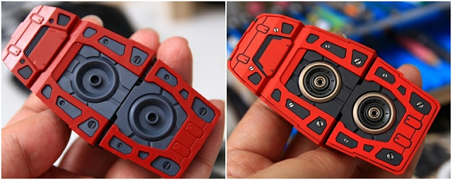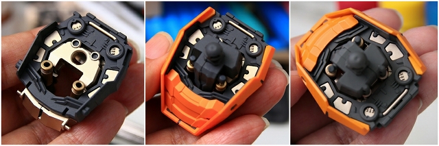 ヘリウムコア(黄色)は2軸の可動があります。まず内側に向けて開き、そのあと2軸とも可動がスムーズになります。白プレート外側は、まず外側に3mmくらいスライドすると、回転可動ができるようになります。