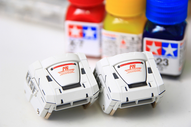 キットのパーツ色分けはかなり良くできているのですが、やはりどうしてもパーツ単位の色分けだと限界があり、機能と色がマッチしてない箇所もあります。これを現実の機能的塗装に塗り替えていきます。ただし実機をそのままスケールダウンすると境界色干渉や縮尺錯視になるので、模型的アニメ的アレンジも加えます。
