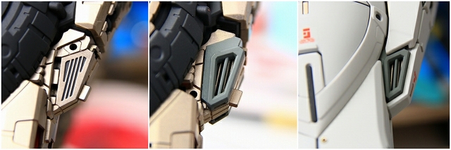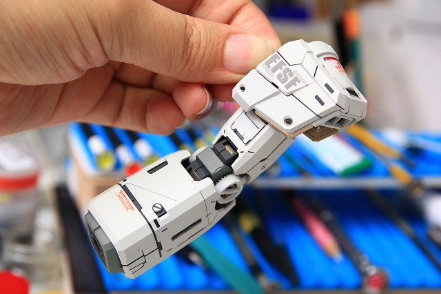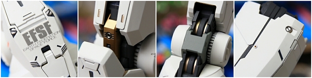またヒザ裏はアドバンスドMSジョイントが露出します。アドバンスドMSジョイントは素材がPE・PPなので加工や塗装ができませんが、できる限りの整形や色合わせを行いました。また周囲の色を目立たせることで、PEPP部分を目立たなくさせるなど、境界色干渉なども利用しました。