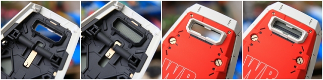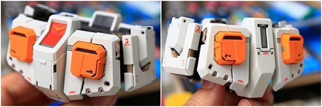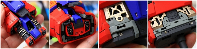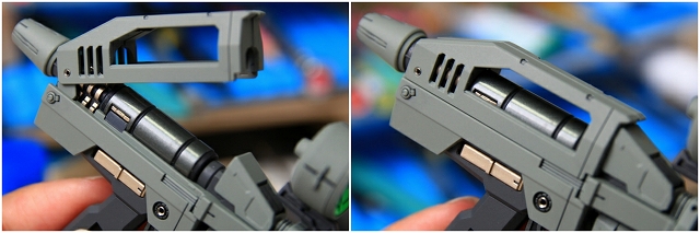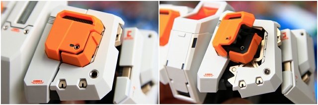 前腕には金属プレス製パーツが仕込まれています。これがシールド側の磁石でマウント結合される仕組みです。磁力の強さは静的ディスプレイには十分ですが、移動やポーズ変更するときは外れ落ちるかもしれませんので注意してください。金属プレスパーツはスライドハッチを閉じると隠れます。