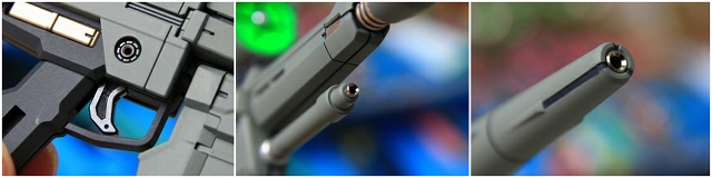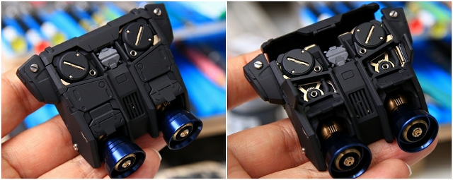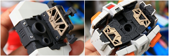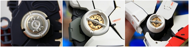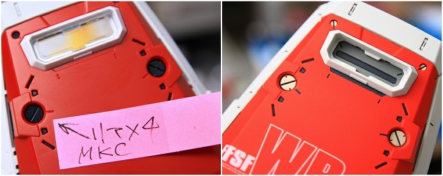 LED内蔵ビームサーベルを差し込むことで、光がバックパック内クリアーパーツを通り、ノズルが光る仕組み、しかし導線が長いため光量が少ない。また消灯するとクリアーレッドパーツのオモチャっぽいディテールが目立ってしまう。ですので発光ギッミックはオミットすることにしました。