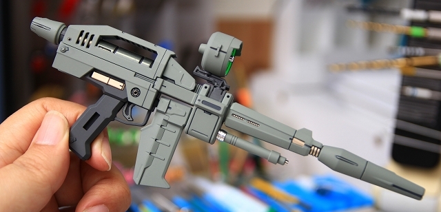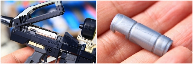 左手グリップにマウントされるマグネット。この部分は完成状態でキットに入っています(誤飲防止とかの安全基準のためかな??)。小さいヤスリやマスキングで製作していきます。