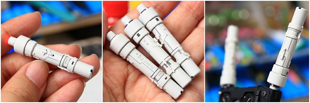サーベルは3本あります。そのうち1本がLED発光内蔵です。発光サーベルだけは金型もディテールも素材も違います。特に素材は、なにかの繊維を織り込んだような不思議な硬さがありました。そのため加工や塗装の感覚がだいぶ違ったのですが、できるだけ3本が揃うようにしました。