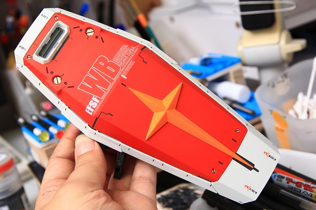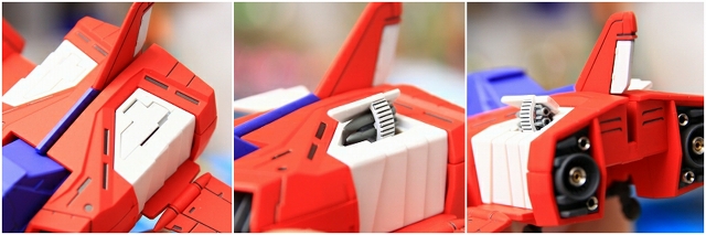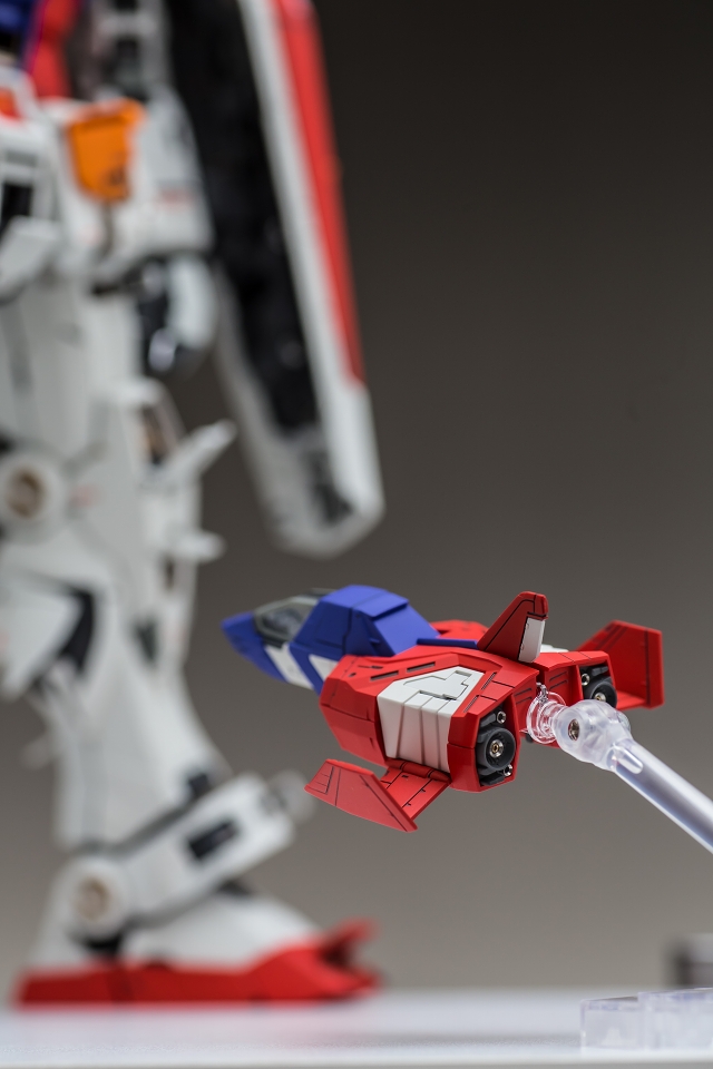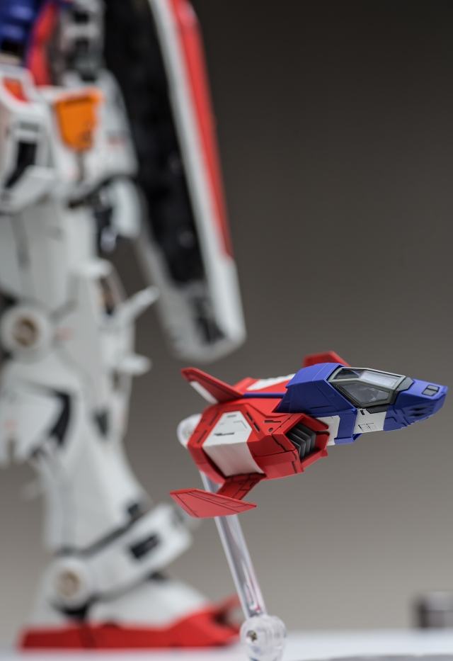従来のコアファイターは直線的な解釈が多かったですが、PGUガンダムは複雑な曲面構成でマッシブなラインになりました。すごく凝ったアレンジです。垂直尾翼は赤1色だったので、赤白の塗り分けにしました。