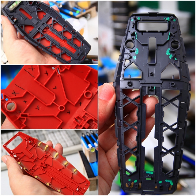 当初、キットの配色&色味だと少し派手すぎると感じたので、いったんはダーク系の色に塗りました。しかし外装でほとんど隠れてしまうのと、光がフレームまで回らず黒つぶれにってしまいました。なので全部分解して「見える部分・隠れる部分」を十分検討し、最終的には写真のようになりました。フレームだけで観るとだいぶ派手ですが、外装パネルを付けるとちょうどよい感じになっています。