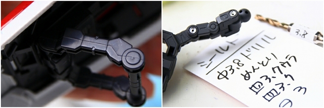 ずいぶん検証しまいたがこの可動の必要性が分からなかったので、まっすぐで固定にしました。芯のフレームがアドバンスドMSジョイントで接着ができず、かつ肉厚もないので強度も足りない。ごく細いネジを数カ所固定することで解決させました。