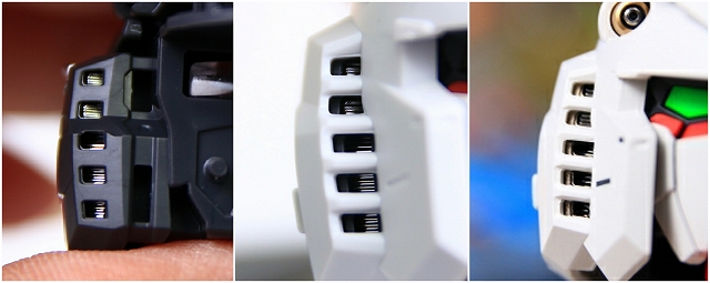 5連ダクトは3重構造になっています、しかしノーマルのままだとせっかくの多重構造がほとんど見えません。そこで5連ダクトの四角形のユガミを整形しつつ穴を拡大。奥のルーバーとスリットフレーム・フェアリングをそれぞれ塗り分けました。写真だと見にくいですが、ノーマルよりもレイヤー構造が目視しやすくなっています。
