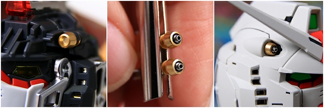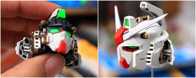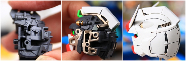 まず頭部の発光についてです。LEDユニットは首の下の胸のあたりに位置します。LEDの光は喉・頭部のクリアーパーツを通り、ツインアイとセンサー前後を光らせます。
