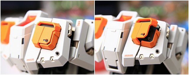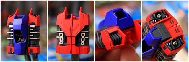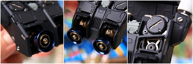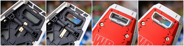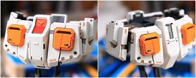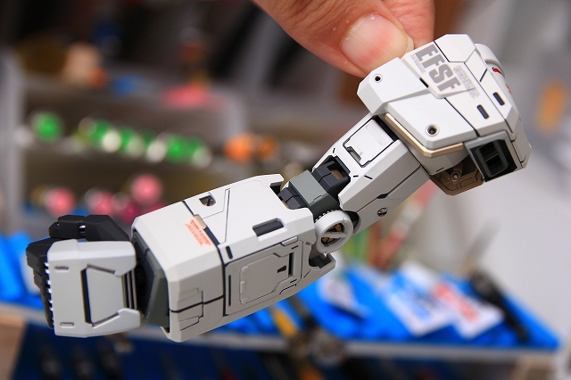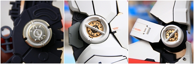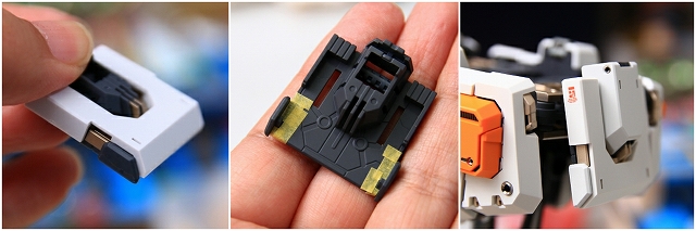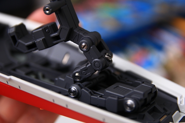 前腕には金属プレス製パーツが仕込まれています。これがシールド側の磁石で結合される仕組みです。磁力の強さは静的ディスプレイには十分ですが、移動やポーズ変更するときは外れ落ちるかもしれませんので注意してください。金属プレスパーツはスライドハッチを閉じると隠れます。