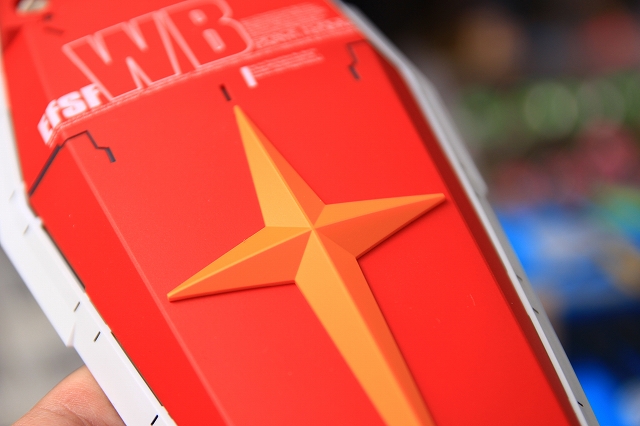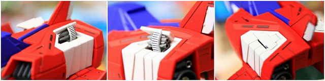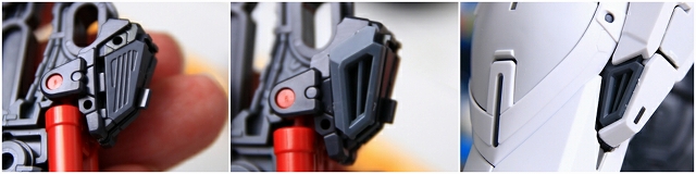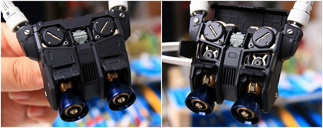 LED内蔵ビームサーベルを差し込むことで、光がバックパック内クリアーパーツを通り、ノズルが光る仕組み、しかし導線が長いため光量が少ない。また消灯するとクリアーレッドパーツのオモチャっぽいディテールが目立ってしまう。ですので発光ギッミックはオミットすることにしました。