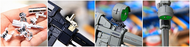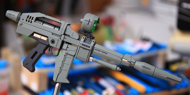 ライフル・レシーバーシリンダー(?)のクロムメッキもおもちゃっぽいので、キレイにメッキ落とし。表面処理し、メタリック専用下地ブラックをツヤツヤに塗布、ペールグリーンメタリックで塗装。クリアーでコーティング。グレー系の塗り分け。この「ペールグリーンメタリック」は、写真だと伝わらないけど、深さと重量感があるお気に入りの色です。