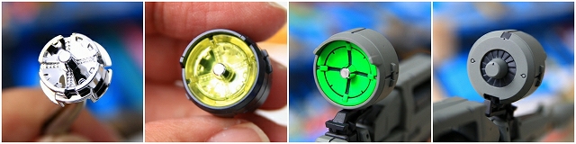 写真左、中央サーベルだけLED発光しています。上段サーベルは無発光ですが、最適化したので光を拾ってます。下段サーベルはノーマル無加工、あきらかに集光率低いです。大改造をせず、基礎的な加工だけで発光力アップできました。