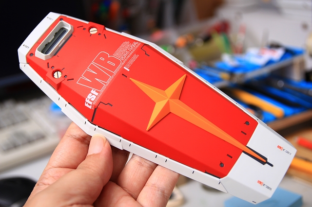 シールド表面はアニメのように柔らかい曲面構成になっていて、良い感じ。それにあわせて連邦十字の取付面も湾曲しています。ただやはり3D曲面同士の取り付けは精度が難しく隙間ができがち。