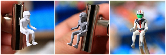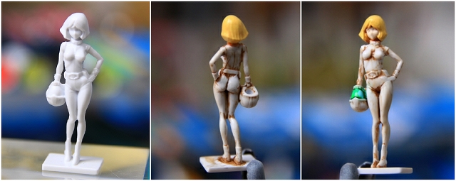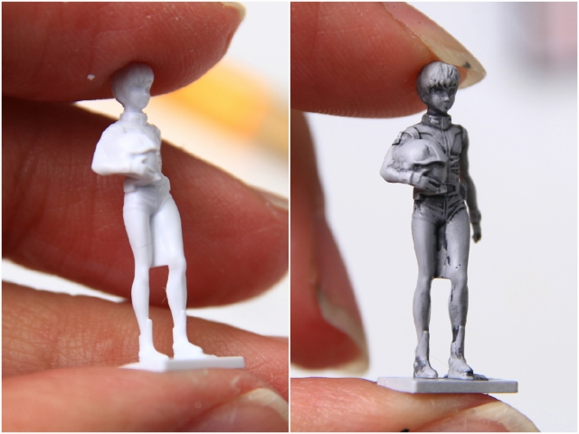 さいわいフィギュアの予備が数体あるので、ノーマル状態やサフ状態(&失敗状態)と並べて見ながら本番制作を行うことができたので、だいぶ効率と精度をアップさせるのに役立ちました。同じようにフィギュア4体全て、ノーマル・サフ・失敗用と見比べながら制作しています。