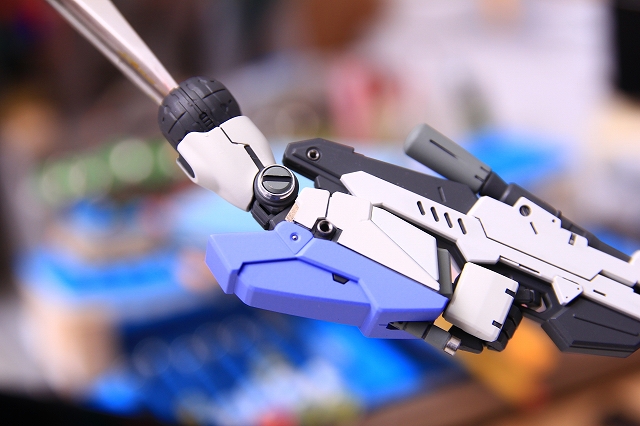 左腕。ディテールもパーツ分割もちょうどよい感じです。手首のシルバー色は構成ラインを崩してると感じます。なので本体色と同じ白にし、同時に周辺の色バランスを整えました。写真では目立たないですが、フレームはダークグレーをベースに、プラチナ・ゴールドなどでアクセントを入れています。