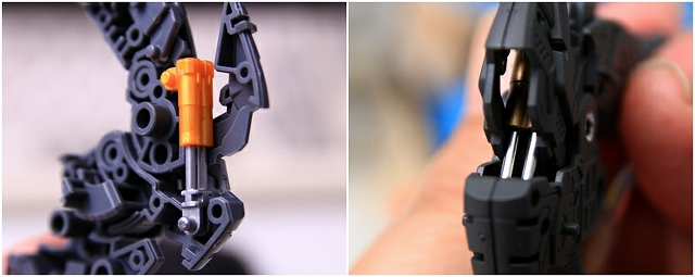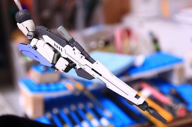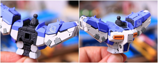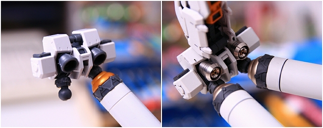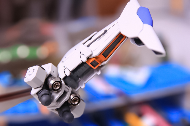 右腕。バルカンはマズルを短くし、銃口にメタルパーツを仕込み。そのほか左腕と同様に塗り分け変更とディテールアップ。