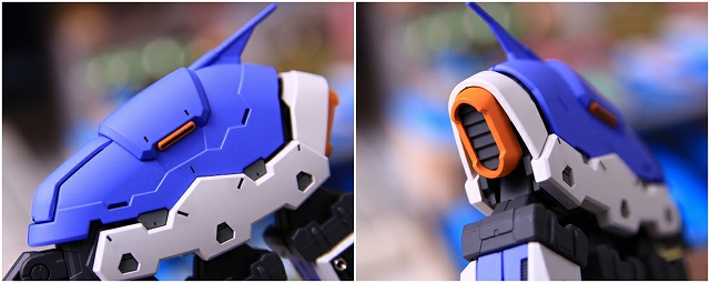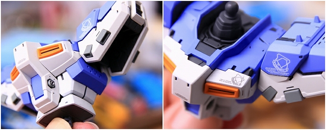 フロントアーマー上端は本来は青ですが、一発抜きで白になっています。ここは大切な色なのでパーツ分けしてもらえたらなお良かったです。でもスジボリが入ってるので青の塗り分けは簡単にできそう。