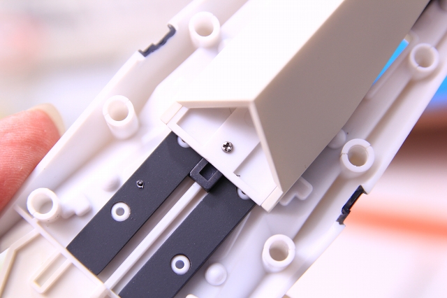 機首のスライド機構。ここが外れると致命傷です。接着剤だと経年で外れたりするので、ネジ固定してあります。