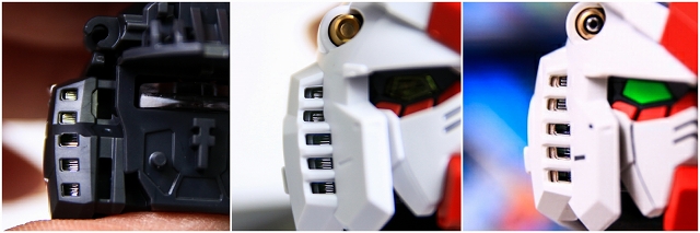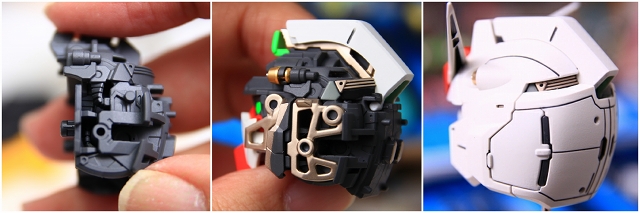 まず頭部の発光についてです。LEDユニットは首の下の胸のあたりに位置します。LEDの光は喉・頭部のクリアーパーツを通り、ツインアイとセンサー前後を光らせる構造です。