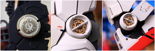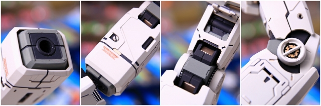 LED内蔵ビームサーベルを差し込むことで、光がバックパック内クリアーパーツを通り、ノズルが光る仕組み、しかし導線が長いため光量が少ない。また消灯するとクリアーレッドパーツのオモチャっぽいディテールが目立ってしまう。ですので発光ギッミックはオミットすることにしました。