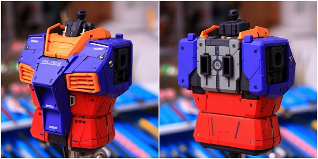 上半身にはコアブロックが収納されます。ただし腰と下半身のジョイントが弱いため「普通のガンプラのように上半身を持ち上げると、下半身がスポッと抜けて落下事故」の可能性が高いです。この対策のため腰回りはネジ打ちで固定しました。(納品後のメンテ等も考慮して、ネジを外せば可動を戻せるようにしてあります)