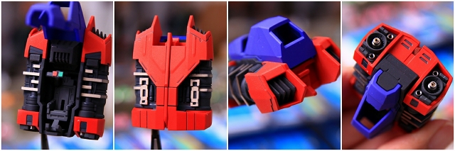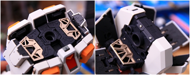 胴体には手足・首・コアブロック・バックパックなど多くのアッセンブルが取り付く上に、さまざまな可動もあるため、少々強度が足りずグラグラします。なので全体的な強度をアップさせる工作に重点を置きました。肩甲骨の2重可動、腰の赤部分のスイング伸縮、上半身と下半身をつなげるプレートフレームなどを改善しました。