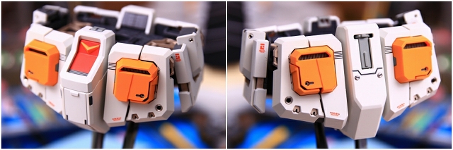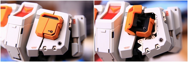 前腕には金属プレス製パーツが仕込まれています。これがシールド側の磁石で結合される仕組みです。磁力の強さは静かにディスプレイには十分ですが、移動やポーズ変更するときは外れ落ちるかもしれませんので注意してください。金属プレスパーツはスライドハッチを閉じると隠れます。