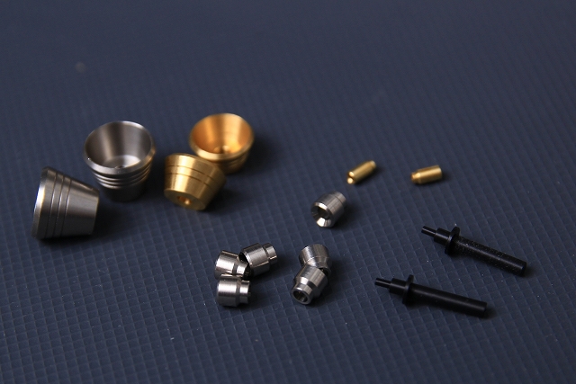 キットのクリアーレッドパーツは取り外し。キット付属メタルノズルの中心穴が約4mmなので、ここにアポジ4mmをピッタリはめ込んで内径2mmにし、PPノズルAをインナーノズルとして取り付けました。
