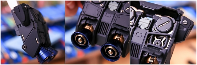 ソールパーツの接地面は3分割可動。つま先&かかとがせり上がります。ただし連動スライドが独特な構造で、しかも完成後には見えなくなるので、内部構造を知らないとまず動かせないと思います(知っててもうまく動かせない)。余談ですがロック解除すると写真右のようにへの字に可動するようになります。